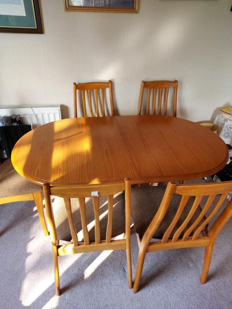 Lovely dining room extendable table with 6 chairs. The extendable panel in built into the table and is a darker colour due to not being used. Sad and reluctant sale. Very good condition £50 or near offer